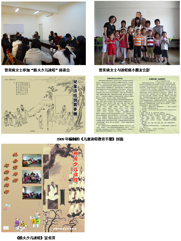 1、與山東師范大學(xué)齊魯文化研究中心合作舉辦薪火少兒讀經(jīng)班4期,并于08年12月7日特別邀請(qǐng)北京大學(xué)哲學(xué)系博士研究生曾美珠女士與讀經(jīng)班教師和家長(zhǎng)在齊魯文化研究中心,就讀經(jīng)的方法以及讀經(jīng)過(guò)程中經(jīng)常遇到的問(wèn)題等進(jìn)行了座談與交流;同時(shí)雙方合作出版《齊魯文化》雜志共3期。