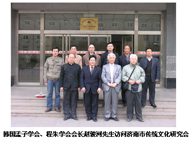 2、2008年4月3日至4日,韓國(guó)同德女子大學(xué)名譽(yù)教授、韓國(guó)孟子學(xué)會(huì)會(huì)長(zhǎng)、韓國(guó)程朱學(xué)會(huì)會(huì)長(zhǎng)趙駿河先生對(duì)濟(jì)南市傳統(tǒng)文化研究會(huì)進(jìn)行了為期兩天的訪問(wèn)。受湯傳忠會(huì)長(zhǎng)委托,車士存秘書長(zhǎng)、彭耀光副秘書長(zhǎng)盛情接待了趙先生。