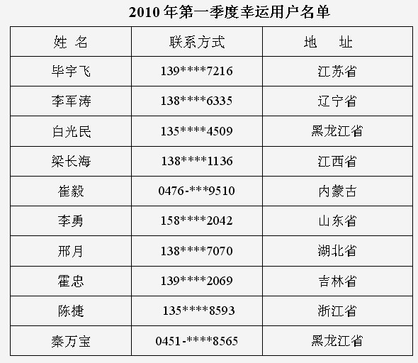 2010年第一季度新稀寶幸運用戶名單