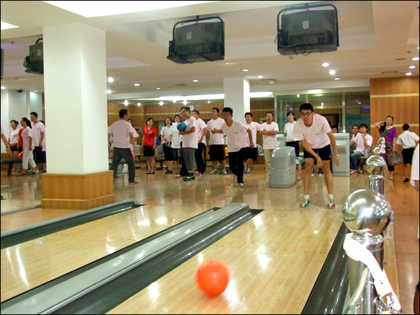 保齡球又叫“地滾球”,起源于德國,是一種在木板球道上用球滾擊木瓶的室內(nèi)體育運動。比賽現(xiàn)場,大家在工作人員的引導(dǎo)下,換上專業(yè)的保齡球鞋,做完熱身運動和結(jié)束練習(xí)后,開始了比賽。很多員工一上手就能看出是“保齡健將”,拿球、下蹲、大鵬展翅式的扔球動作,動作標(biāo)準(zhǔn)、嫻熟、到位,一球命中,引起現(xiàn)場人員一陣歡呼,很快成為比賽場上的“明星”;接下來“眾相百出”: 有的因為“失誤”而頓足捶胸,有的因為“幸運”而洋洋得意——比賽氣氛也由之前的輕松活躍變得緊張激烈,大家你爭我奪、毫不示弱,慢慢地進入了白熱化階段,最終山西區(qū)域的毛潔銀、河南區(qū)域的常紅星分別榮獲了女子組和男子組的冠軍。