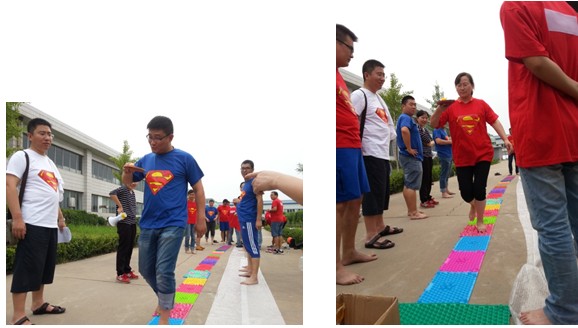 “心有靈犀”結(jié)束后,藍隊紅隊穿好隊服轉(zhuǎn)戰(zhàn)到戶外,大家的激情遠遠超過了戶外天氣的熱度。主持人剛剛講解完比賽規(guī)則,大家就投入到了比賽活動中,一個個隊員光著腳板在指壓板上快速前進,手上還小心翼翼的用乒乓球拍端著乒乓球,眼睛目不轉(zhuǎn)睛的盯著球拍上的乒乓球,臉上用各種表情來表達腳板的感覺和對球拍上乒乓球的關(guān)注。每個隊員都成功的端著球走過了指壓板,大家熱烈地討論并分享著自己的感受。