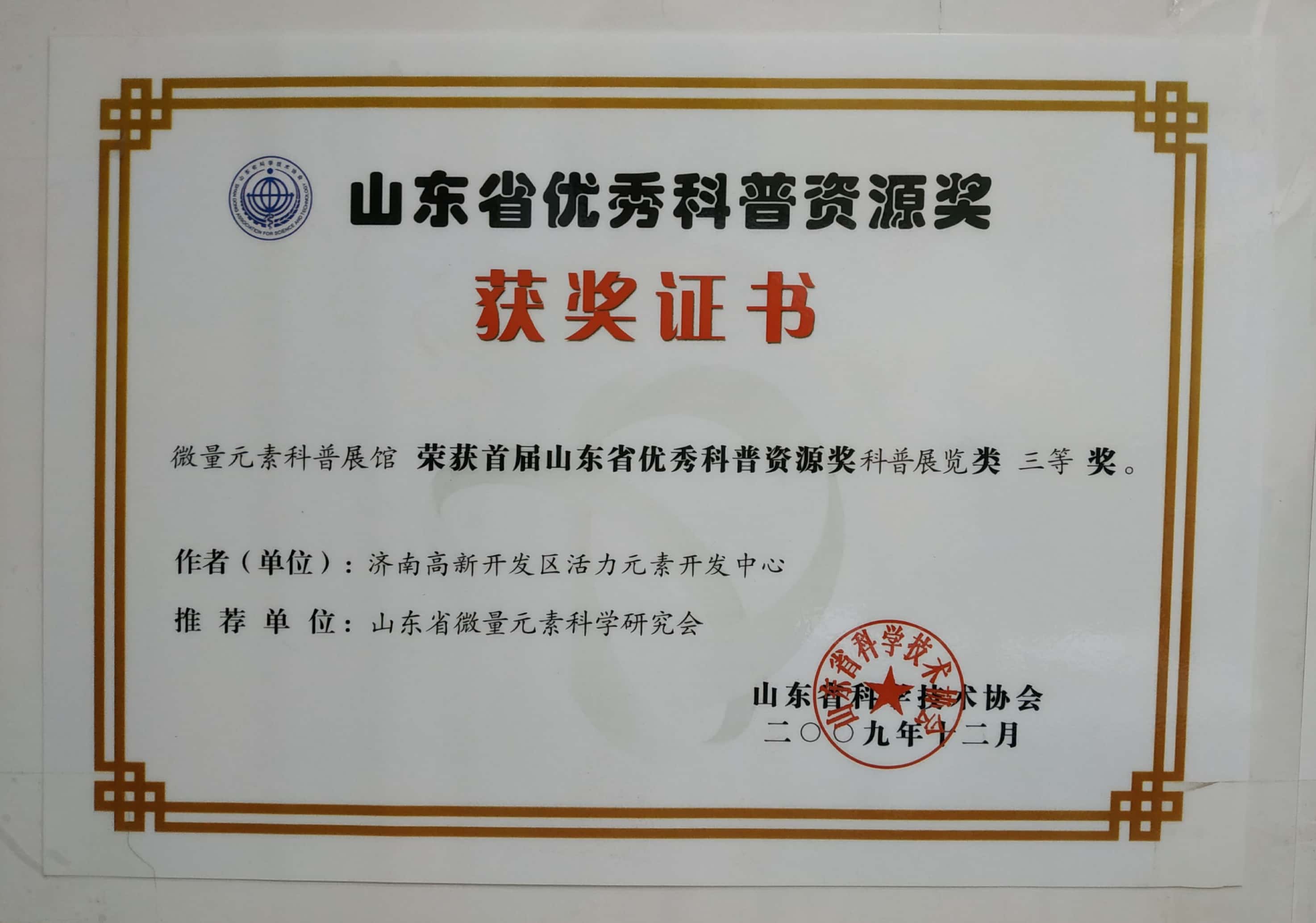 2009年被山東省科學(xué)技術(shù)協(xié)會評為“山東省優(yōu)秀科普資源獎”