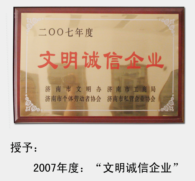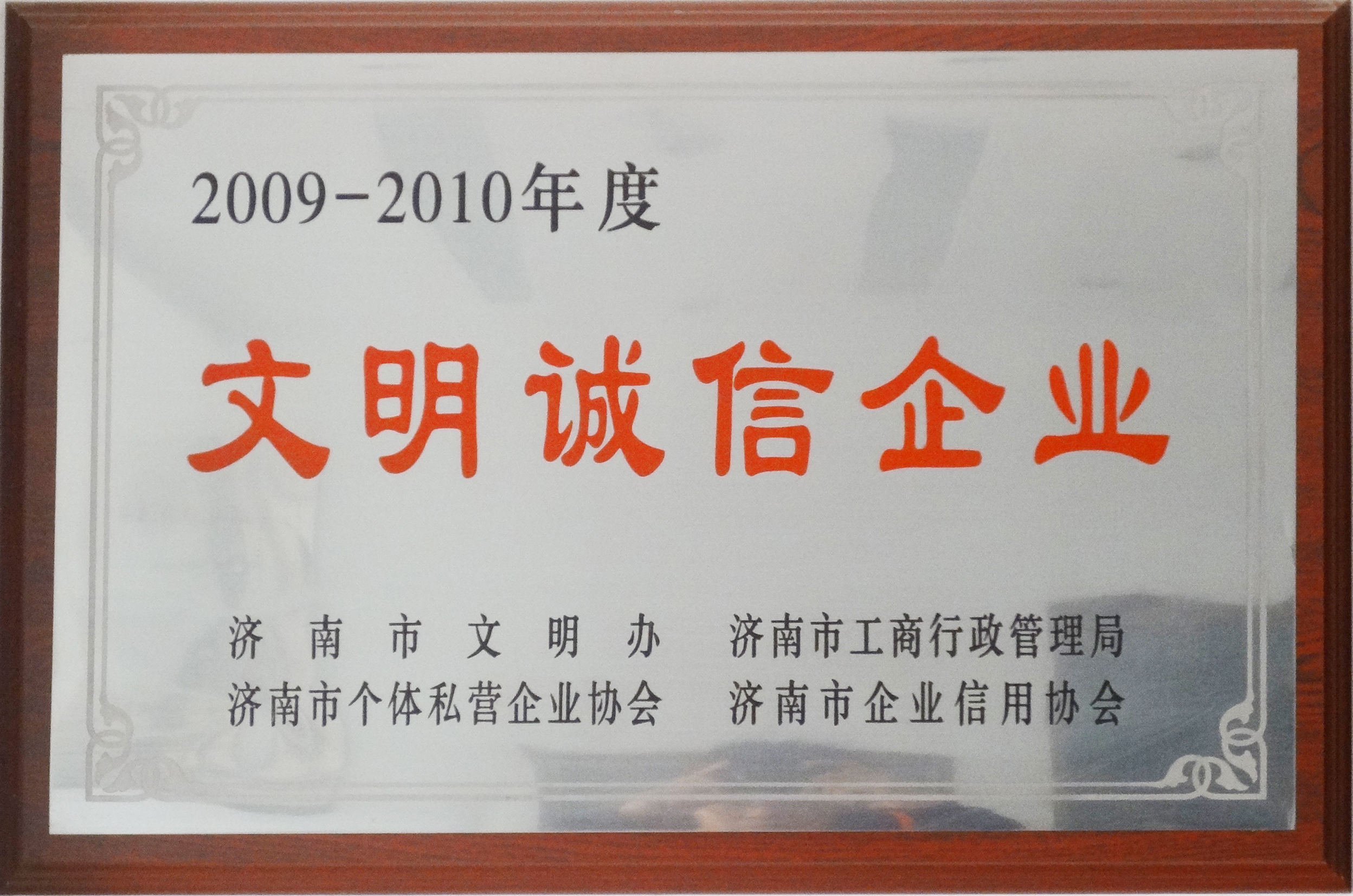 2005~2010年,被濟(jì)南市委宣傳部、濟(jì)南市文明辦、濟(jì)南市工商局、濟(jì)南市個(gè)私協(xié)會(huì)評(píng)為“文明誠(chéng)信民營(yíng)企業(yè)”