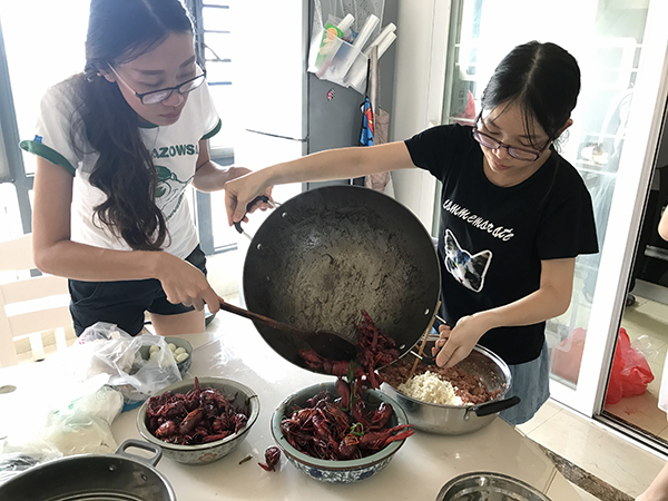 大廚們陸續(xù)到場(chǎng),不一會(huì)廚房?jī)?nèi)就已經(jīng)熱火朝天,洗菜、切菜,忙得不亦樂乎。很快的,第一道熱菜就下鍋了,第一道熱菜是小云做的十三香小龍蝦,只見她用刷子 把小龍蝦仔仔細(xì)細(xì)刷了一遍,最激動(dòng)人心的就是下鍋的那一刻了,爆香蔥姜后再把小龍蝦倒進(jìn)鍋里,頓時(shí)發(fā)出“呲啦”的聲音,快速翻炒小龍蝦,沒過多久就陣陣飄 香,小龍蝦的香味讓同事們的饞蟲都被勾出來了。