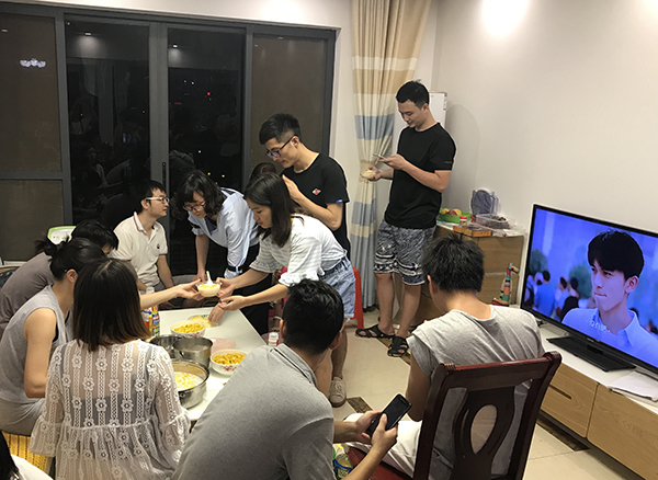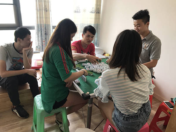 相較于廚房?jī)?nèi)的熱火朝天,客廳里卻是另一番景象。大家就像是在自己家里一樣,放松地坐在沙發(fā)上聊天、看電視、吃水果,還有的同事湊成桌打麻將,偶爾聽廚房 里大廚們的“差遣”打打下手。相比于工作時(shí)間內(nèi)的合作,這個(gè)時(shí)候的大家更像是一家人,相處更放松、更愜意。多了工作以外的接觸和了解,相信大家以后在工作 中溝通更加順利、合作更加親密無間。