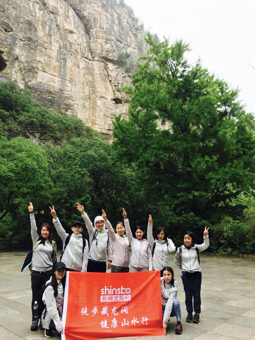 徒步開(kāi)始,每個(gè)人都興致勃勃,縱然陰郁的天氣也阻擋不了我們?nèi)杠S的心情。全體集合后,人力資源部辛艷作為組織者,代表公司每人配發(fā)了一件防曬衣,既能防曬,又能統(tǒng)一標(biāo)識(shí),大家也都欣喜的穿上身,還未出發(fā),就先集體自拍了一番。
