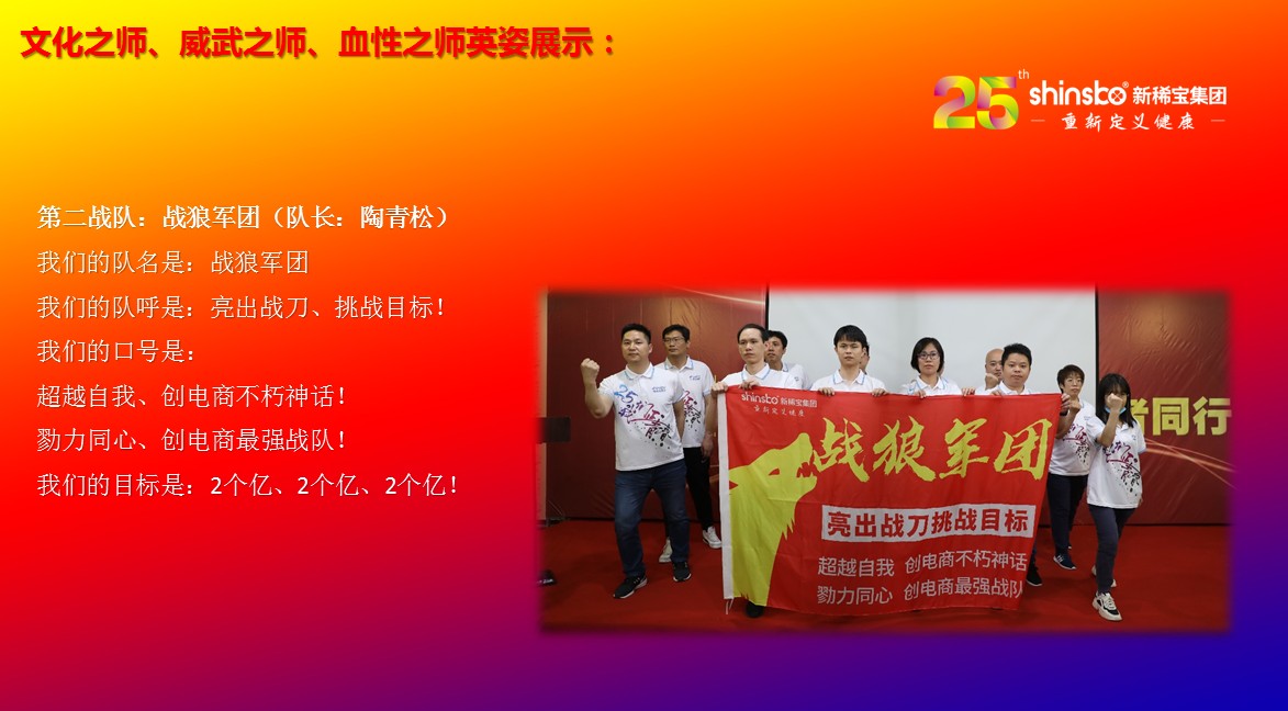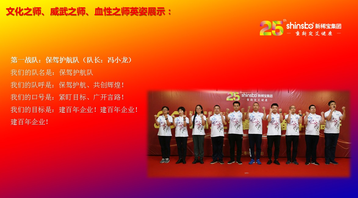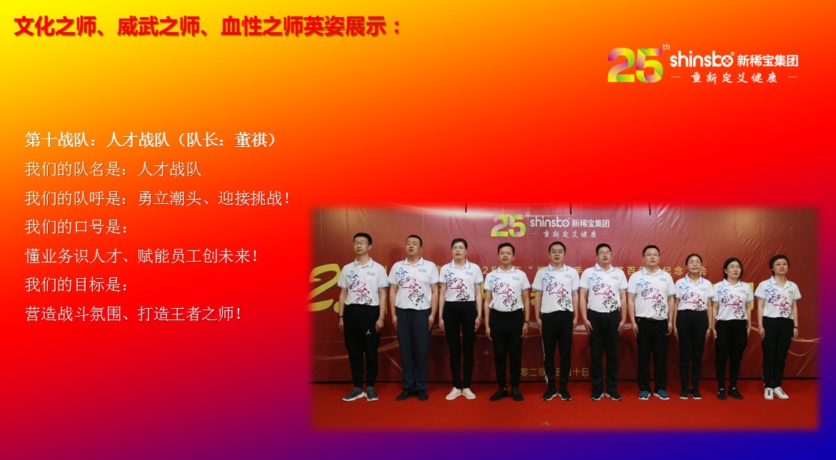 在文化儀式后緊接著舉行了隆重的“文化之師、威武之師、血性之師” 誓師大會(huì)。各戰(zhàn)隊(duì)步入會(huì)場就被熱烈的現(xiàn)場氛圍所感染,主屏展架抒寫“25我們正青春”與奮斗者同行的格言,大紅背景墻點(diǎn)綴出新稀寶集團(tuán)“相聚攜手 共筑百年”25周年紀(jì)念大會(huì)”活動(dòng)主題,兩條大氣宏偉、耀眼奪目橫幅 “增強(qiáng)緊迫感、聚焦主戰(zhàn)場、打好翻身仗;抓住新機(jī)遇、創(chuàng)造新優(yōu)勢、再創(chuàng)新輝煌”為誓師大會(huì)營造了良好戰(zhàn)斗氛圍,使各戰(zhàn)隊(duì)、各戰(zhàn)將從視覺上、思想上、感知上,感受到公司的凝聚力、向心力、變革力、戰(zhàn)斗力。