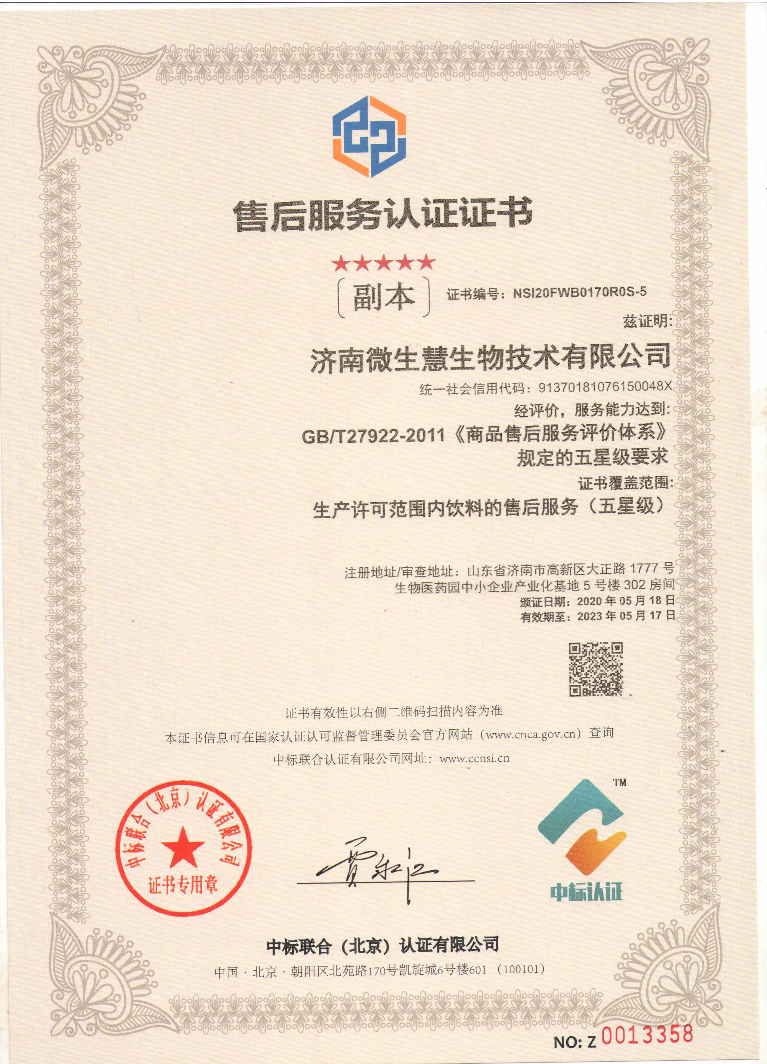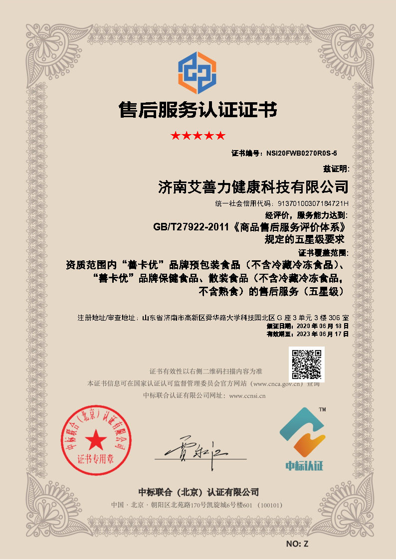 售后服務(wù)認(rèn)證證書(shū)